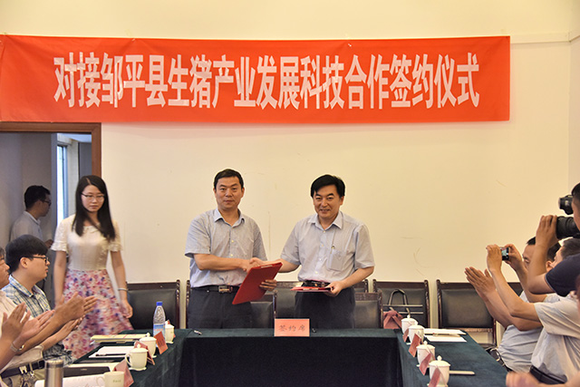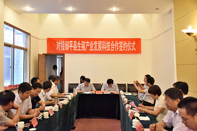 2017年6月25日,我院与邹平县畜牧兽医局联合共建邹平县畜牧兽医研学产合作创新中心签约启动仪式在邹平举行。邹平县副县长马兵、滨州市畜牧兽医局局郑红丽副局长、我院院长沈志强研究员在仪式上分别致辞。我院院长沈志强研究员与邹平县畜牧兽医局张向阳局长代表双方签订战略合作协议。