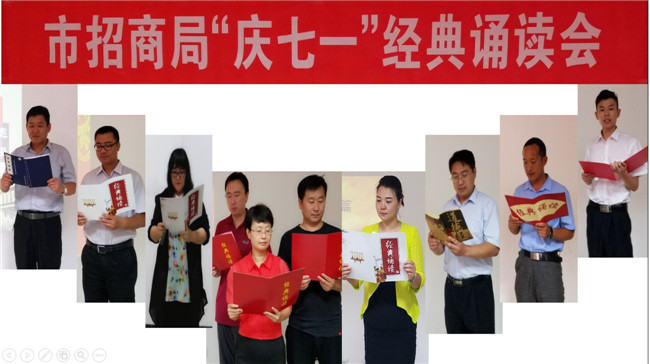 按照市招商局《关于开展“传承文化诵经典,践行文明强招商”系列活动的通知》要求,结合“主题党日”活动,为纪念中国共产党建党96周年,进一步丰富局机关精神文化生活,弘扬中华优秀传统文化,践行社会主义核心价值观,2017年6月23日,市招商局举办了“庆七一”经典诵读会。