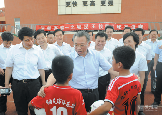 随后,刘家义来到滨州实验学校,调研足球进校园情况。看到孩子们在球场上奔跑跳跃,尽情享受足球带来的快乐,刘家义非常高兴,走上前来与孩子们互动交流,鼓励他们在足球运动中放飞梦想,健康快乐成长。他强调,足球运动不仅增强体质,更能激发孩子们的顽强拼搏精神,要做好足球运动校园普及,促进青少年强身健体、全面发展。