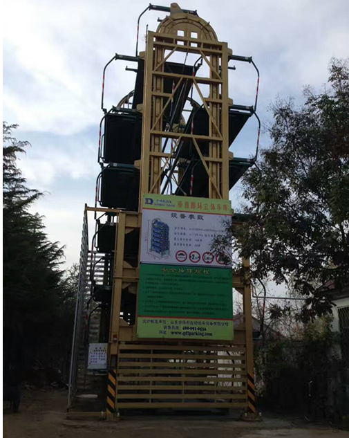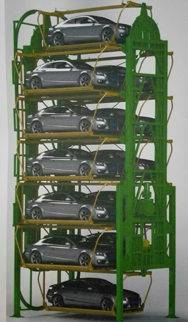 所谓垂直循环式立体车库,是以垂直方向做循环运动的停车系统,完成存取车辆。分为小型循环和大型循环两种,小型循环一般设置车位8-10个,大循环一般设置12-34个车位。从外观上看,该设备就像是一个“摩天轮”。汽车进入“摩天轮”最下方的车位,完成存车流程后,该车位将像摩天轮一样上升,从而实现“空中”停车的效果。