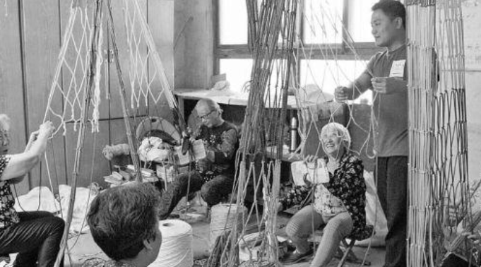 李方震和他的老太太编网队在编织彩虹绳网。
