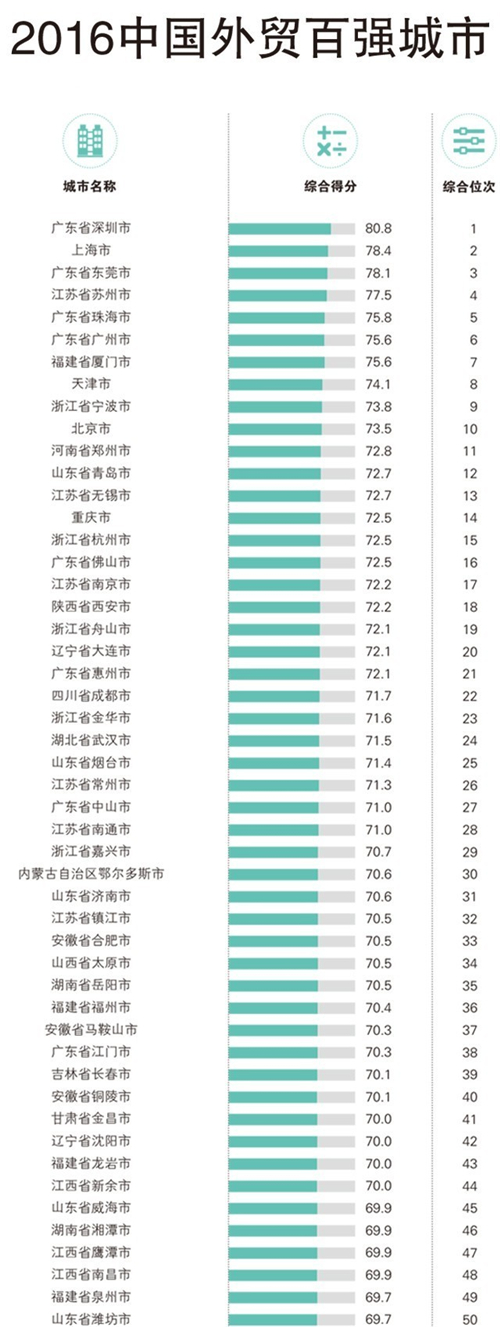 海关总署近日完成了“2016中国外贸百强城市” 名单,并由海关总署主管的《中国海关》杂志公布。其中前三位分别为广东省深圳市、上海市以及广东省东莞市。名单中江苏、山东和广东省均有10座城市入围,浙江省有9座城市入围。滨州市在这个名单中,排名第95位。