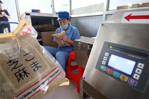 8月3日,无棣丰香园芝麻食品公司的员工正在对即将出口日本的芝麻制品进行金属检测。