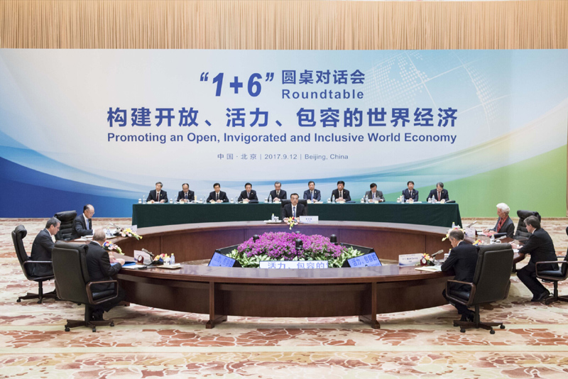 国务院总理李克强9月12日上午在钓鱼台芳华苑同世界银行行长金墉、国际货币基金组织总裁拉加德、世界贸易组织总干事阿泽维多、国际劳工组织总干事莱德、经济合作与发展组织秘书长古里亚、金融稳定理事会主席卡尼举行第二次“1+6”圆桌对话会,在会议第二阶段围绕“推动中国经济转型升级”主题深入交流。
