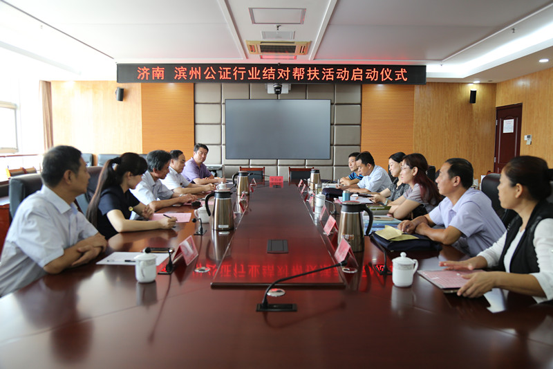9月13日,济南市司法局公证管理处处长付竹义一行5人到滨州市开展结对帮扶活动。济南市泉城公证处主任刘景学与惠民县公证处、无棣县公证处主任在帮扶启动仪式上签署了帮扶协议,并赠送了办公设备。随后召开了两地结对帮扶座谈会。滨州市司法局副局长吴涛,各县区分管局长、公证处主任参加了座谈。