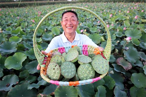 9月11日, 信阳镇郭打绳村的荷塘里天驷家庭农场负责人郭金祥在展示刚摘的莲蓬。