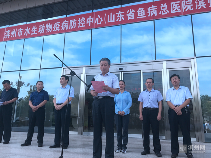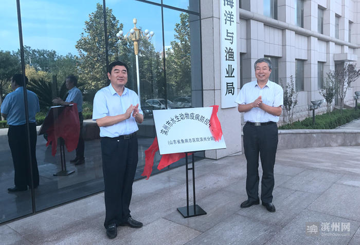 滨州日报·滨州网9月19日讯 9月19日,滨州市水生动物疫病防控中心成立揭牌仪式暨山东省渔病防治专家委员会成立仪式在市海洋与渔业局举办,省海洋与渔业厅有关部门、全省17地市海洋与渔业系统的相关负责人及专家,各县区海洋与渔业局代表参加活动。省海洋与渔业厅副厅长宋继宝、市政府副市长贾善银出席仪式,并为滨州市水生动物疫病防控中心揭牌。