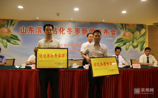 新闻发布会现场为两家沾化冬枣专卖店授牌