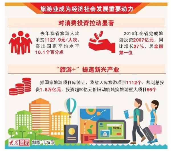 旅游业与上下游产业的积极融合,对我省消费和投资的拉动效应显著。从消费拉动看,去年我省旅游人均消费1127.9元/人次,高出国家平均水平10.1个百分点;从投资拉动看,2016年全省完成旅游投资2007亿元,同比增长27%,居全国第一位;从出口拉动看,2016年全省接待入境游客485.5万人次,入境游客消费30.6亿元,分别同比增长5.3%和5.8%。旅游业为稳增长、促改革、调结构、防风险作出了积极贡献,成为拉动经济社会发展的重要动力。