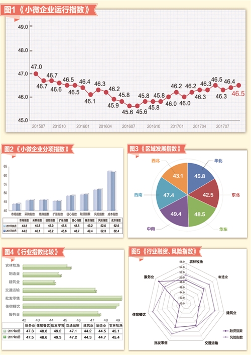 2017年9月份,“经济日报-中国邮政储蓄银行小微企业运行指数”(见图1)为46.5,较上月微升0.1个点,表明本月小微企业运行稳中有升。