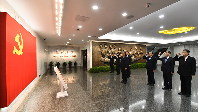 10月31日,中共中央总书记、国家主席、中央军委主席习近平带领中共中央政治局常委李克强、栗战书、汪洋、王沪宁、赵乐际、韩正,瞻仰上海中共一大会址和浙江嘉兴南湖红船。这是31日上午,在上海中共一大会址纪念馆,习近平带领其他中共中央政治局常委同志一起重温入党誓词。新华社记者 李涛 摄