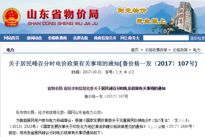 齐鲁网济南11月3日讯(记者 王春令)记者3日从山东省物价局官网获悉,11月1日起,山东将在全省范围内推行居民生活用电峰谷分时电价政策,鼓励利用谷段低价电采暖。以用电量最多的第一阶梯为例,即在现行阶梯电价标准上,高峰用电时段每度电比原来贵0.03元,用电低谷时段每度电比原来便宜0.17元。