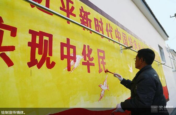 滨州日报·滨州网讯 11月28日,在滨州经济技术开发区沙河街道放粮张村的村头,美术工作者正在绘制大型宣传画。