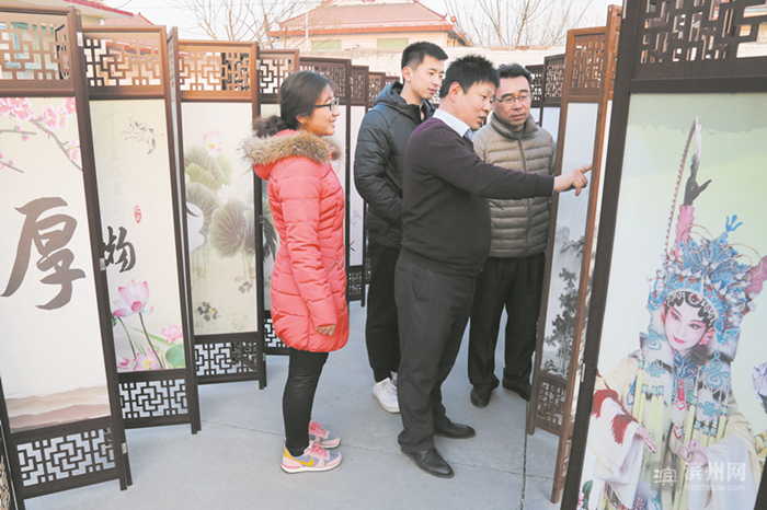 滨州日报·滨州网博兴讯 12月12日,在博兴县湖滨镇寨卞村,张超(右二)向外地客商介绍自己的中国传统屏风工艺品情况。