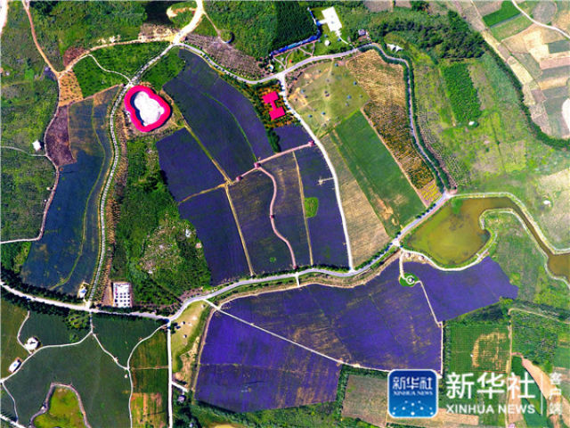 这是5月26日航拍的广西忻城县薰衣草庄园。通过农业、文化、旅游的深度融合,从农业供给侧改革上精准发力,忻城走出了一条以农业产业创新带动第三产业发展的道路。