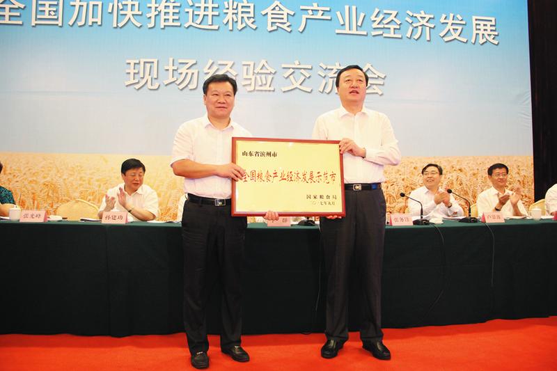 2017年9月12日-13日,全国加快推进粮食产业经济发展现场经验交流会在滨州召开。会议深入学习了贯彻党中央、国务院关于促进粮食产业经济发展的决策部署,国家粮食局党组书记、局长张务锋作重要讲话,认真分析了粮食产业经济发展面临的新形势,研究部署了贯彻落实粮食产业创新发展、转型升级、提质增效的思路、任务和举措。来自全国31个省(直辖市、自治区)的200余名代表参加了会议。会上,国家粮食局授予我市“全国粮食产业经济发展示范市”称号。