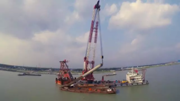 这是一个让世界瞠目的施工方案,中国人要把120米的钢桩,分成两节进行组合安装。
