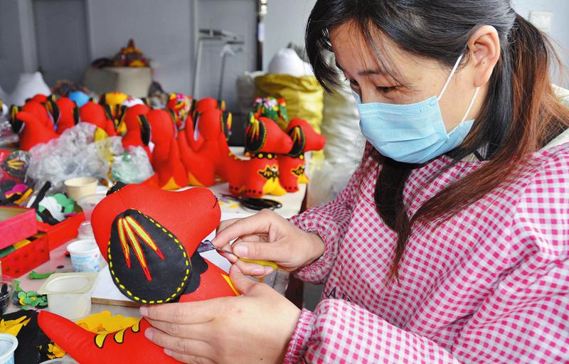 目前,布老虎、发财狗、年年有鱼、中华龙、十二生肖等民间布艺工艺品达500余种,销往全国各地及日本、韩国、匈牙利等国家,带动1000余农家妇女就业。图为1月4日,在东寅布艺有限公司加工车间,一名农家妇女在赶制新年“发财狗”手工艺品订单。