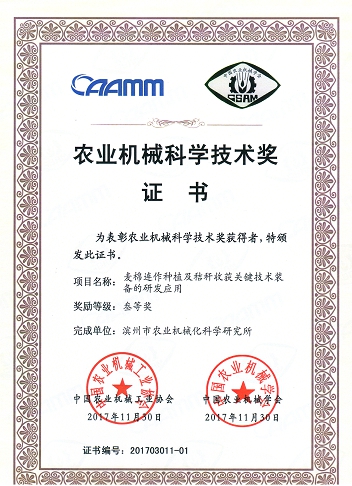 1月9日,“2017年全国农机工业工作会议暨中国农业机械工业协会五届六次理事会会议”在北京召开。期间,中国农机工业协会和中国农业机械学会主办的“中国农业机械科学技术奖颁奖典礼”举行,滨州市农机化所申报的“麦棉连作种植及秸秆收获关键技术装备的研发应用”斩获三等奖,成为山东省荣获此项奖励的五个项目之一,同时是省内获此殊荣唯一的科研院所。
