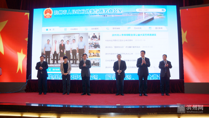 仪式上,与会人员一起观看了滨州外侨网宣传片。市政府外侨办主任就滨州外侨网的筹备建设情况、市政府外侨办2017年的工作实绩和2018年的工作安排进行了介绍。市政府经济顾问、以色列RBL咨询公司执行董事艾蕊女士,旅法山东同乡会副会长宋鲁郑先生,德国山东商会常务副会长、德国万格思有限责任公司执行总经理王晓峰先生分别在西班牙、法国和德国向启动仪式发来祝贺视频。吴圣光与市人大民族侨务外事委员会、市政协台港澳侨和外事委员会、市政府外侨办、市政府督查室、滨州黄河三角洲新媒体文化传播中心负责人共同上台开启网站启动程序。
