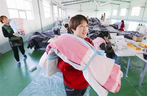 1月4日,柳堡镇段家村的育龄妇女张绍丽姐妹在村企安广家纺厂务工。