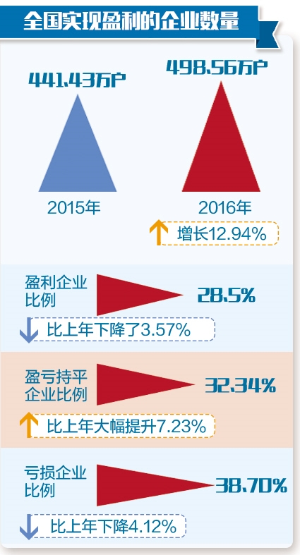 分析纳入《报告》统计的企业年报可以看到,2016年,全国实现盈利的企业数量由2015年的441.43万户增至498.56万户,同比增长12.94%。盈利企业比例为28.5%,比上年下降3.57%;盈亏持平企业占比为32.34%,比上年大幅提升7.23%;亏损企业占比38.70%,比上年下降4.12%。