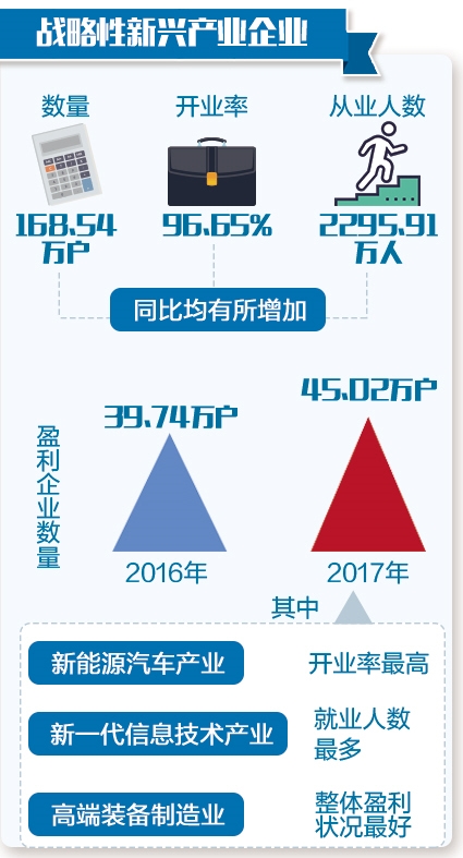 与以上这组数据相对应的是,我国战略性新兴产业企业发展势头良好——企业数量达168.54万户,开业率为96.65%,从业人数达2295.91万人,同比均有所增加。同时,盈利企业数量从上年的39.74万户上升至45.02万户。其中,新能源汽车产业开业率最高,新一代信息技术产业吸纳就业人数最多,高端装备制造业整体盈利状况最好,显示出战略性新兴产业正在加速成为新的经济增长点。