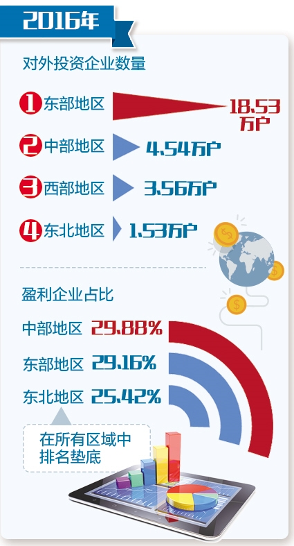不过,开业不代表“活得好”。在衡量企业做大做强的关键指标上,东北企业明显落了下风。比如,2016年东北地区对外投资企业数量最低,为1.53万户;东部地区对外投资企业数量最多,为18.53万户;中部、西部地区对外投资企业数量分别为4.54万户、3.56万户。又比如,东部和中部地区盈利企业占比相对较高,分别为29.16%和29.88%,其中河北、甘肃、浙江等省份的盈利企业占比高于全国平均水平。东北地区盈利企业占比仅为25.42%,在所有区域中排名垫底。这也从一个侧面说明,振兴东北依旧任重道远。