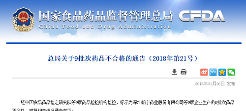 日前,记者从国家食品药品监督管理局官方网站获悉,经中国食品药品检定研究院等9家药品检验机构检验,标示为齐鲁制药有限公司、深圳翰宇药业股份有限公司等9家企业生产的9批次药品不合格。通告显示,齐鲁制药有限公司生产的批号为5120108AE的注射用头孢拉定不合格,不合格项目包括性状、含量测定、崩解时限、重量差异、装量差异、含膏量、效价测定。