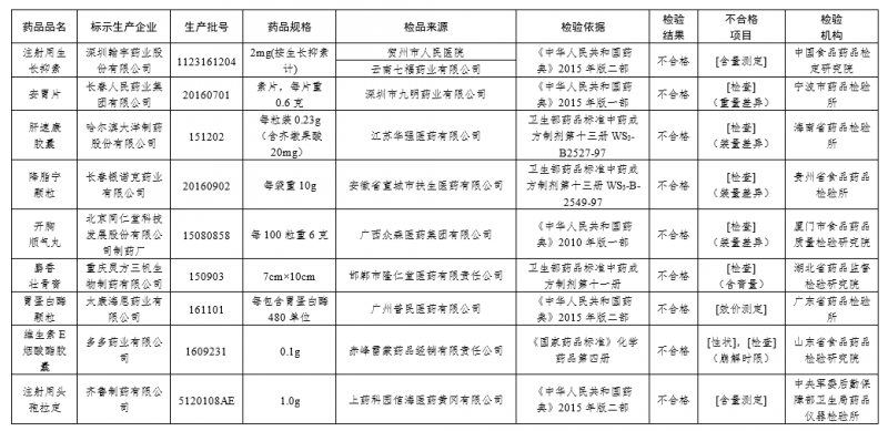 齐鲁制药有限公司生产的批号为5120108AE的注射用头孢拉定,深圳翰宇药业股份有限公司生产的批号为1123161204的注射用生长抑素,长春人民药业集团有限公司生产的批号为20160701的安胃片,哈尔滨大洋制药股份有限公司生产的批号为151202的肝速康胶囊,长春银诺克药业有限公司生产的批号为20160902的降脂宁颗粒,北京同仁堂科技发展股份有限公司制药厂生产的批号为15080858的开胸顺气丸,重庆灵方三帆生物制药有限公司生产的批号为150903的麝香壮骨膏,太康海恩药业有限公司生产的批号为161101的胃蛋白酶颗粒,多多药业有限公司生产的批号为1609231的维生素E烟酸酯胶囊。不合格项目包括性状、含量测定、崩解时限、重量差异、装量差异、含膏量、效价测定。