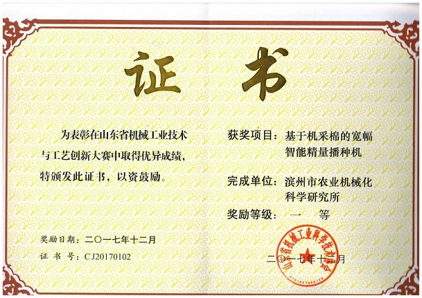 近日,山东省机械工业科学技术协会公布了《关于表彰2017第二届山东省机械工业技术与工艺创新大赛获奖单位和人员的决定》。滨州市农业机械化科学研究所喜获一等奖2项,二等奖1项,三等奖2项,2人被授予“山东省国防机械电子工业系统五一劳动奖章”,4人被授予“山东省机械行业优秀科技工作者”荣誉称号。