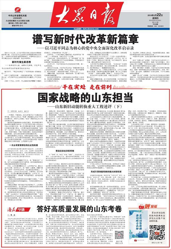 一年更新,万象勃发。在2018年春天这个充满生机的季节里,没有什么词汇比“机遇”更能描述山东当下所处的发展时刻,没有什么词语比“担当”更能形容山东人现在的激动心情。
