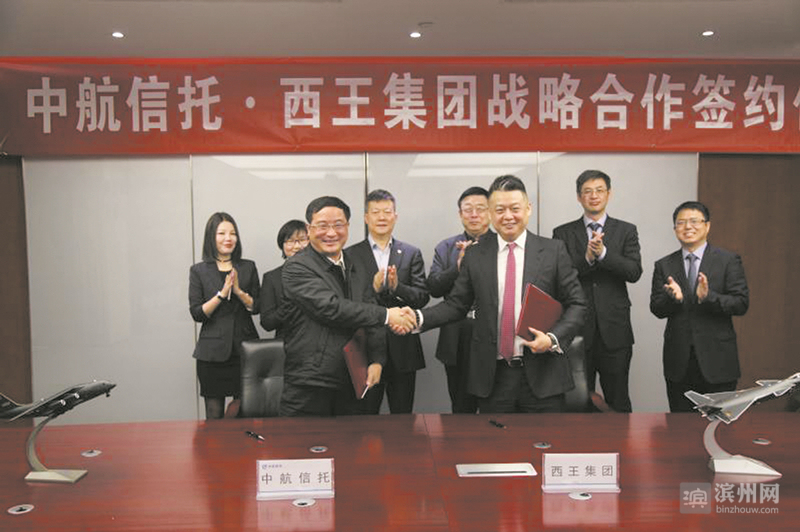 滨州日报·滨州网讯 3月5日,西王集团有限公司与世界500强企业中国航空工业集团有限公司旗下中航信托股份有限公司在北京进行战略合作签约。根据协议,双方将深入开展在供应链金融、物流、贸易以及资本市场等多领域的合作。中航信托董事长姚江涛、副总经理魏颖晖,西王集团董事长王勇、总裁王棣出席签约仪式。