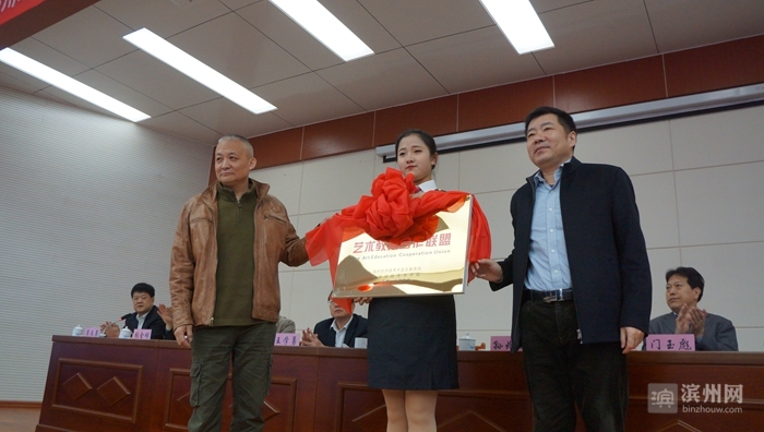 滨州学院艺术学院院长孔新苗与滨州经济技术开发区党工委委员、管委会副主任董凤家为“艺术教育合作联盟”揭牌