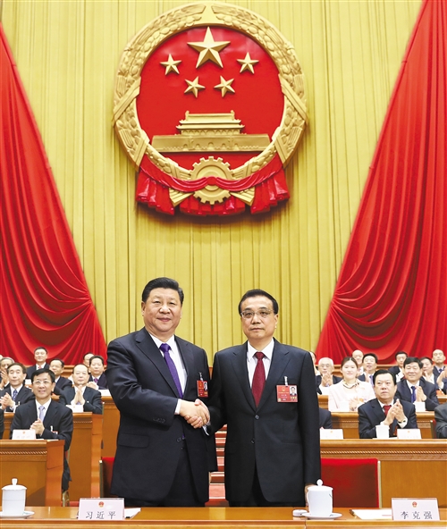 3月18日,十三届全国人大一次会议在北京人民大会堂举行第六次全体会议。根据国家主席习近平的提名,经过投票表决,决定李克强为中华人民共和国国务院总理。这是习近平同李克强亲切握手。 新华社记者 鞠 鹏摄