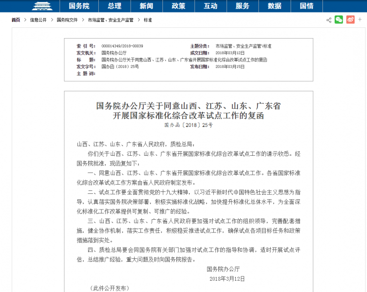 齐鲁网济南3月15日讯 2018年3月15日,中国政府网发布《国务院办公厅关于同意山西、江苏、山东、广东省开展国家标准化综合改革试点工作的复函》。复函中指出,国务院办公厅同意山西、江苏、山东、广东省开展国家标准化综合改革试点工作。各省国家标准化综合改革试点工作方案由省人民政府制定发布。