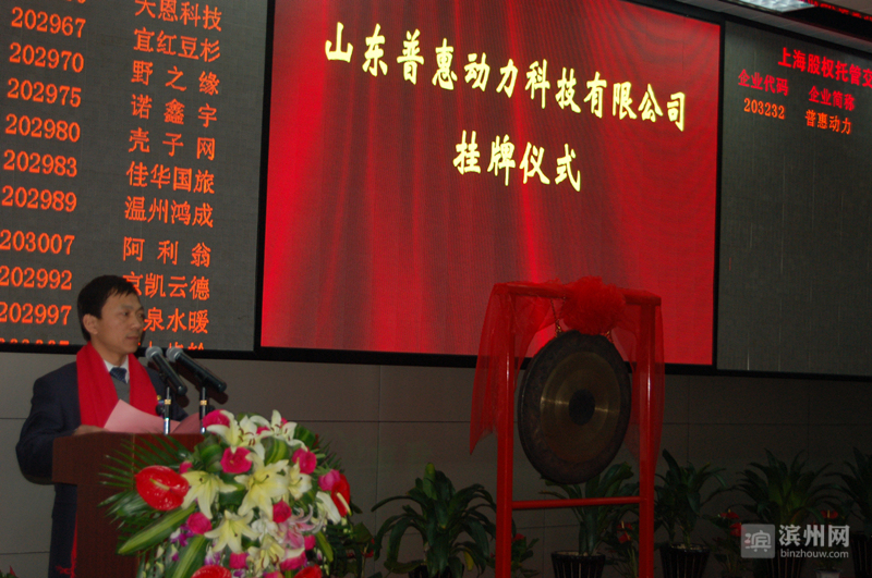 2014年12月31日下午5时,随着一声清脆的铜锣响,山东普惠动力科技有限公司正式在上海股权托管交易中心中小企业股权报价系统挂牌上市。在仪式上,徐振峰说:“目前,我们还处在企业发展的初级阶段,登录上海股权托管交易中心Q版也只是企业迈入金融市场的开始,当我们在恰当的时机完成融资后,普惠动力将继续扩充产能,加大技术投入,力争在3到5年内在行业内拥有话语权,参与技术标准行业规范的制定。”