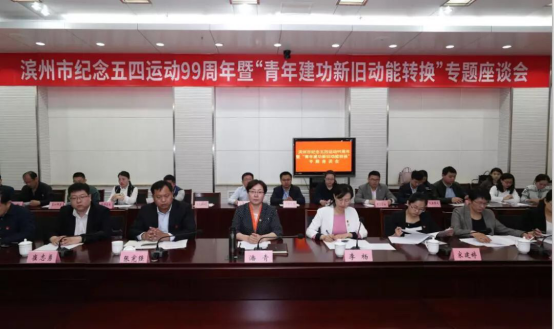 滨州日报/滨州网5月5日讯 5月4日,我市纪念五四运动99周年暨“青年建功新旧动能转换”专题座谈会召开。副市长潘青出席会议并讲话,滨化集团股份有限公司董事长、党委书记张忠正致辞,市青联、青企协、青创联合会的骨干会员代表,部分市直团组织书记及优秀青年代表70人参加座谈。