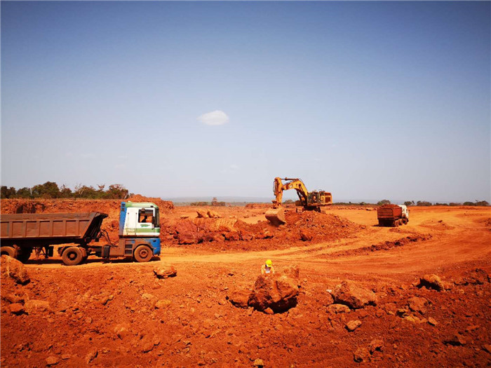 几内亚达必隆港二号港区,大货车将铝土矿运进,而后装船运抵中国滨州。