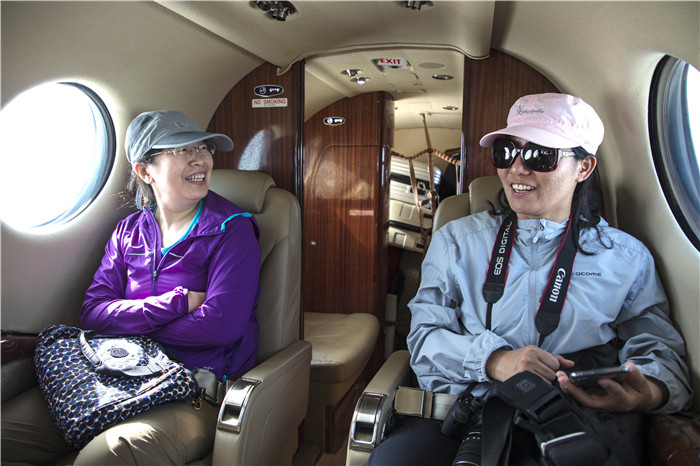 滨州日报滨州网记者(右)乘坐赢联盟的飞机去矿区采访。
