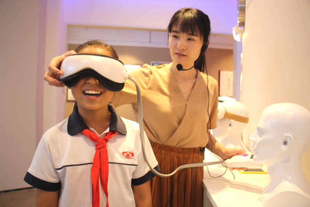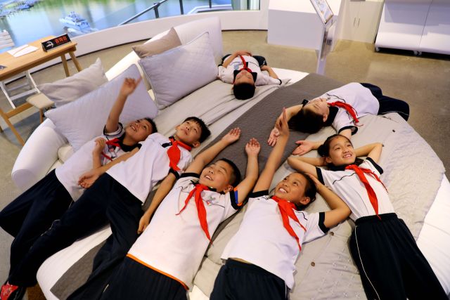 5月30日,山东省滨州高新区实验学校的小学生在愉悦家纺居家世博馆健康睡眠中心体验家纺床品。 新华社发(张春峰 摄)