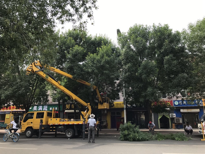 滨州市老城区部分路段遮挡路灯光线的行道树“理发”