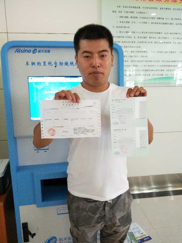 6月11日,我市第一台车辆购置税自助机在无棣县政务服务大厅启用。该自助机集证件扫描、刷卡交税、票证出具、档案留存等功能于一体,具有操作简便、办理时间短的特点,极大地方便了缴税群众,也减轻了窗口工作人员的工作负担。图为无棣县昊远运输有限公司刘卫炎展示自助机打印出来的车辆购置税完税证明。