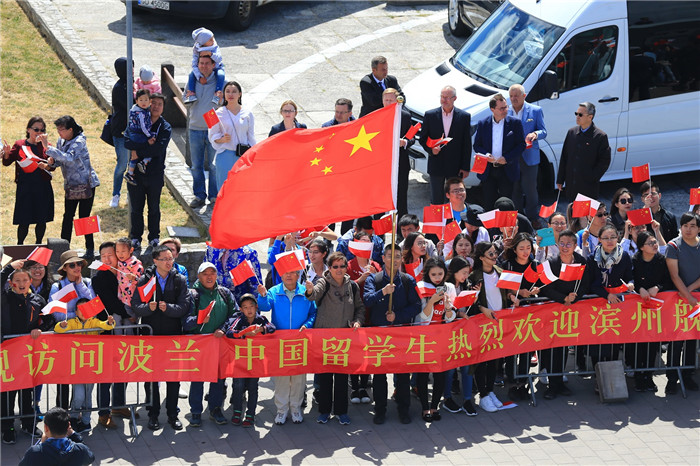 而在22日下午14时许,滨州舰抵达波兰格丁尼亚港波莫瑞码头,官兵在甲板上整齐列队,向前来码头迎接的波兰海军作战中心主任雅沃尔斯基准将、格丁尼亚议长杰林斯卡、中国驻波兰大使馆代办姚东晔,以及中资机构、华人华侨、留学生代表约300余人挥手致意。