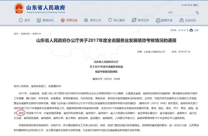 记者7月2日从省政府网站获悉,山东省人民政府办公厅对2017年度全省服务业发展绩效考核情况进行通报。