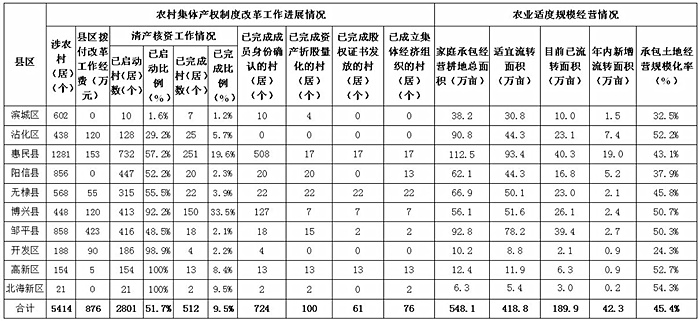 市委、市政府高度重视农村集体产权制度改革和引导农村土地经营权有序流转发展农业适度规模经营工作,将其作为深化农村改革的重大措施,纳入科学发展综合考核体系,确定将农村集体产权制度改革工作扩大到所有涉农乡镇(街道),10月底前完成农村集体资产清产核资工作,年底前60%的村(居)完成农村集体产权制度改革,2018年全市农业土地承包经营规模化率达到50%。