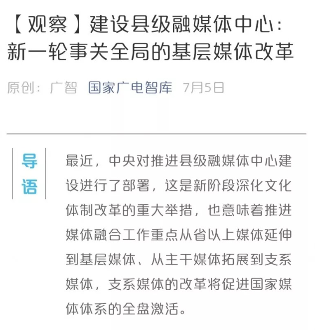 小编注意到,对于“县级融媒体中心建设”这一改革,“国家广电智库”7月5日的文章还谈到了几个要点。