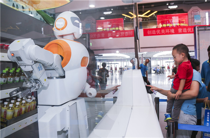 售货机器人吸引了许多市民前来购买商品,只需选择商品跟数量并投入一元、五元、十元硬币或纸币,就可以拿到商品。
