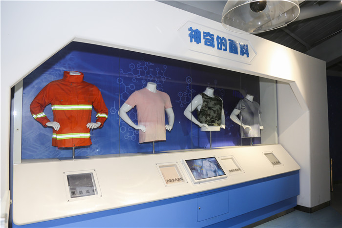 神奇的面料展示橱窗里,包括愉悦家纺的抗菌面料。