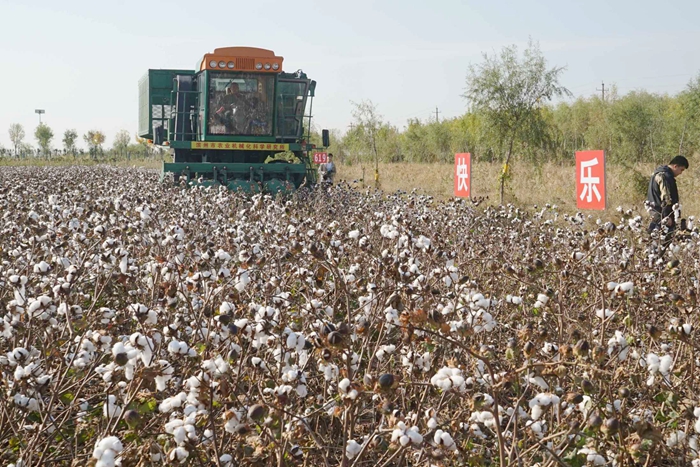 资料图:10月22日,国家棉花产业联盟黄河三角洲高品质棉花新品种现场观摩会在黄河三角洲(滨州)国家农业科技园区棉花全程机械化农机农艺融合示范基地举行。